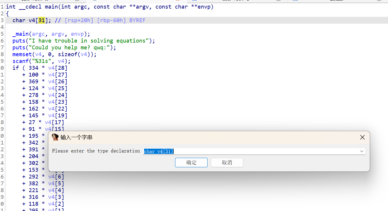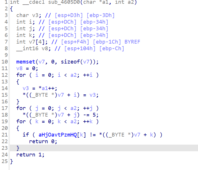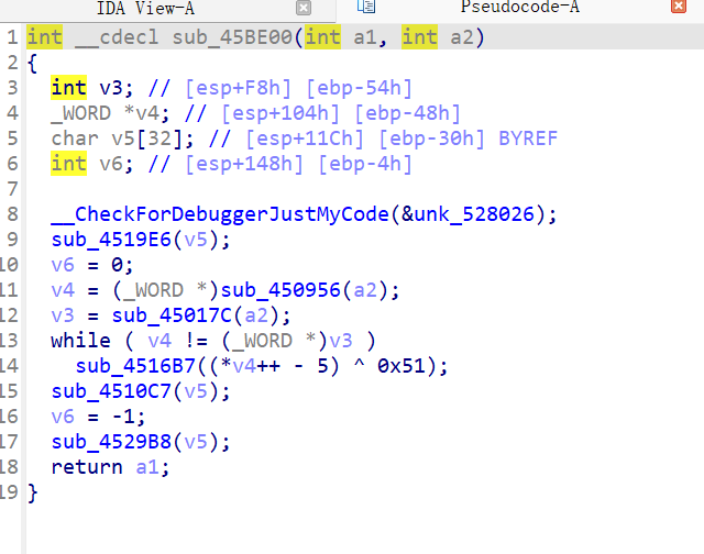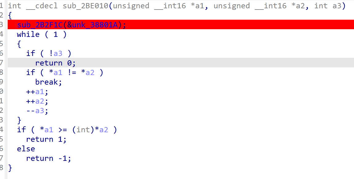 到这里就比较明显了,大概意思就是两块内存地址比较(ida给的是伪代码,大都描述的是内存关系,这一点和平常写的c区别还是比较大的)这里*a1其实就是一块连续的内存地址也是数组,a3是长度,动调验证一下