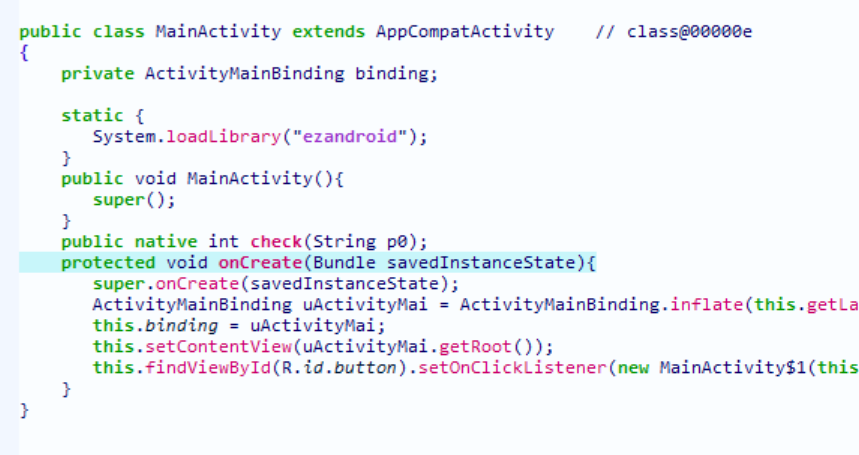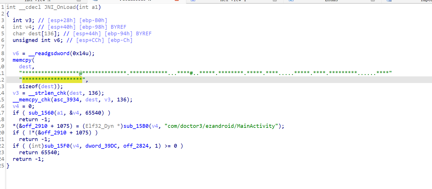 看到了sub_17F0(v4, (__int64)”com/doctor3/ezandroid/MainActivity”);后,我们可以大胆猜测这个函数是FindClass函数,v4应该是jni_env,然后直接猜测是动态注册,点开sub_1820的第三个参数