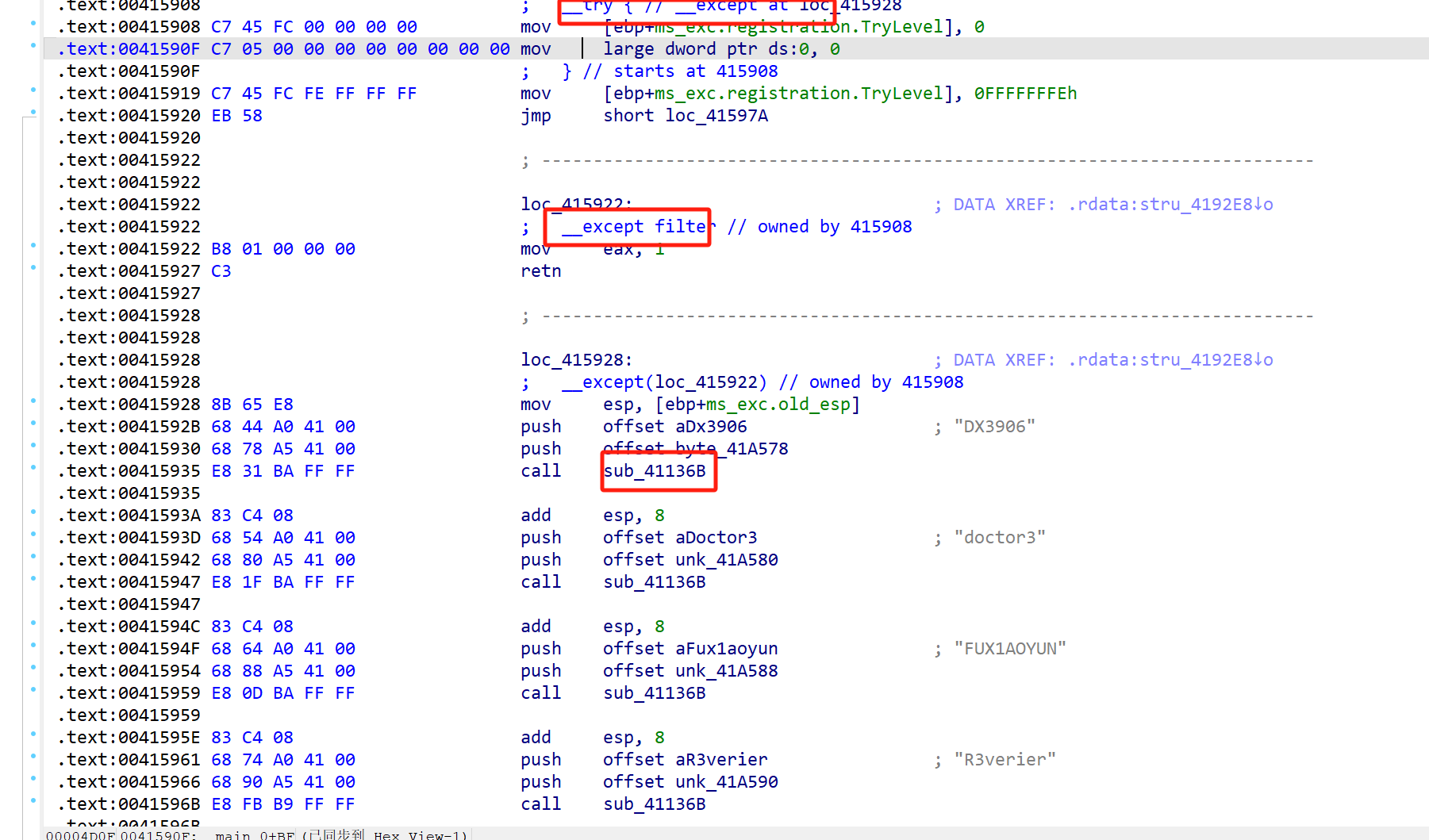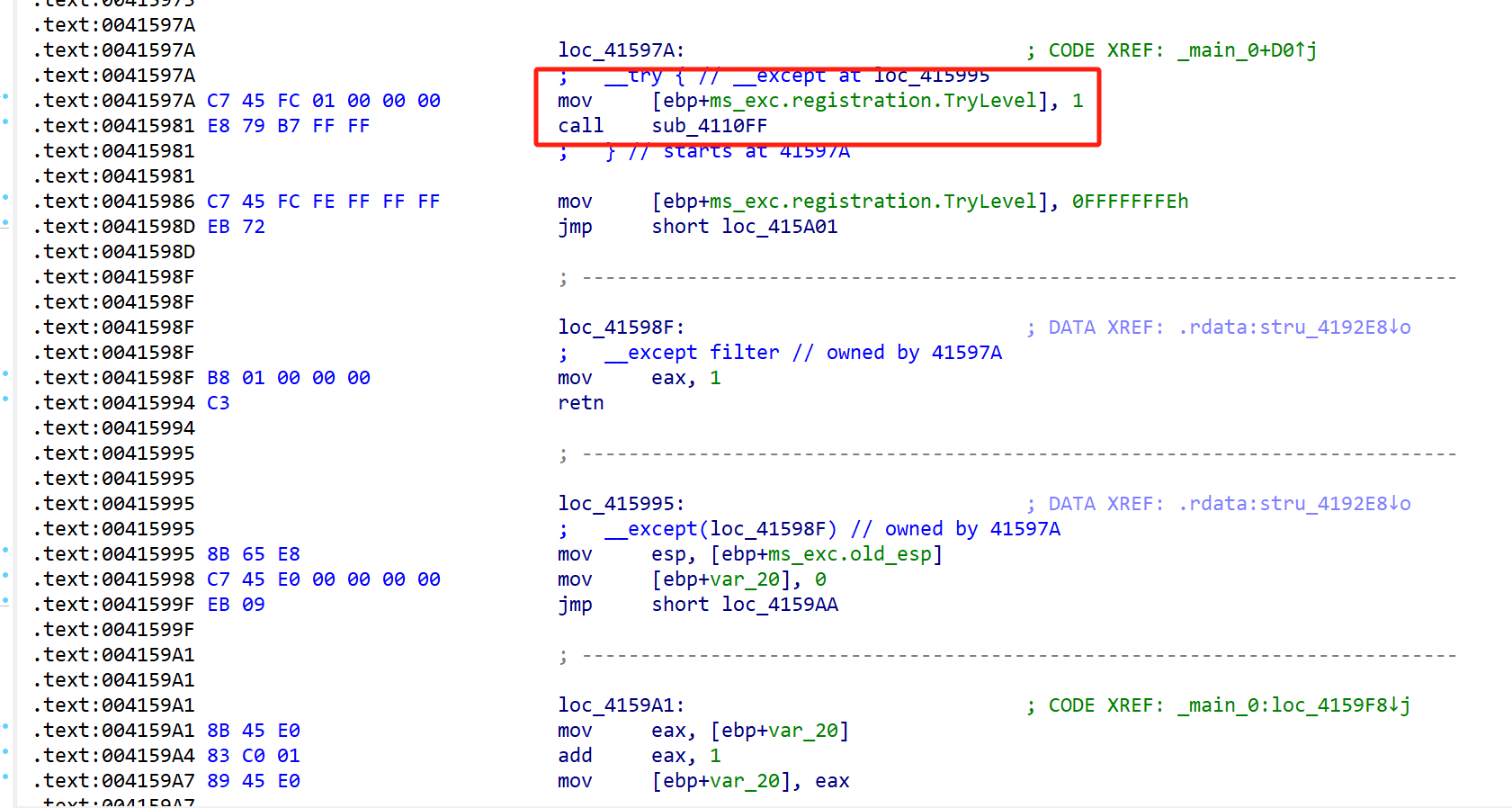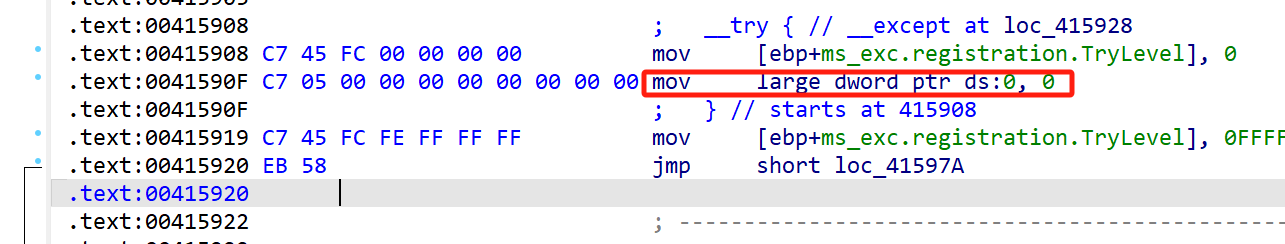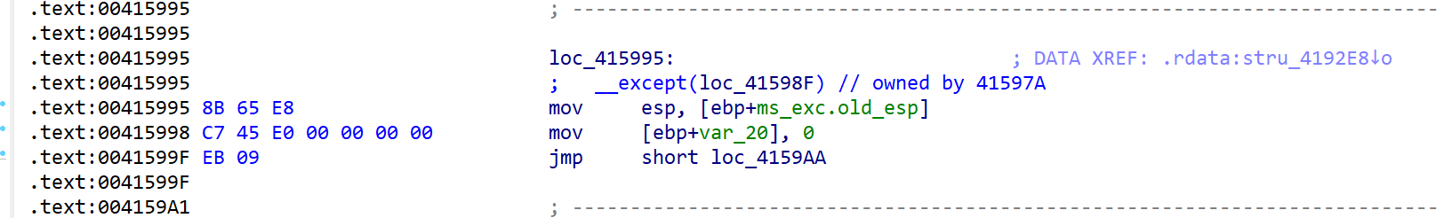 filter为1表示全局展开,调用 RtlUnwind,RtlUnwind 又会起一个 EH4_EXCEPTION_REGISTRATION->Handler,也就是这里的 loc_415928__except 块