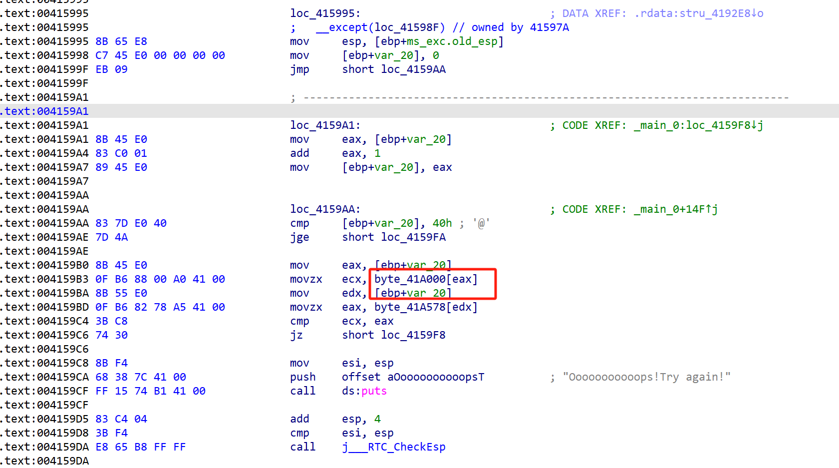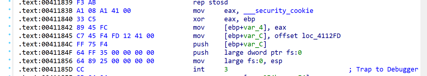 出题人在这里插入了一个异常链表的节点,这个节点里的 loc_4112FD 函数第一次被 RtlDispatchException 调用,紧接着在栈展开时又被调用一次,也就是说后半部分执行两次