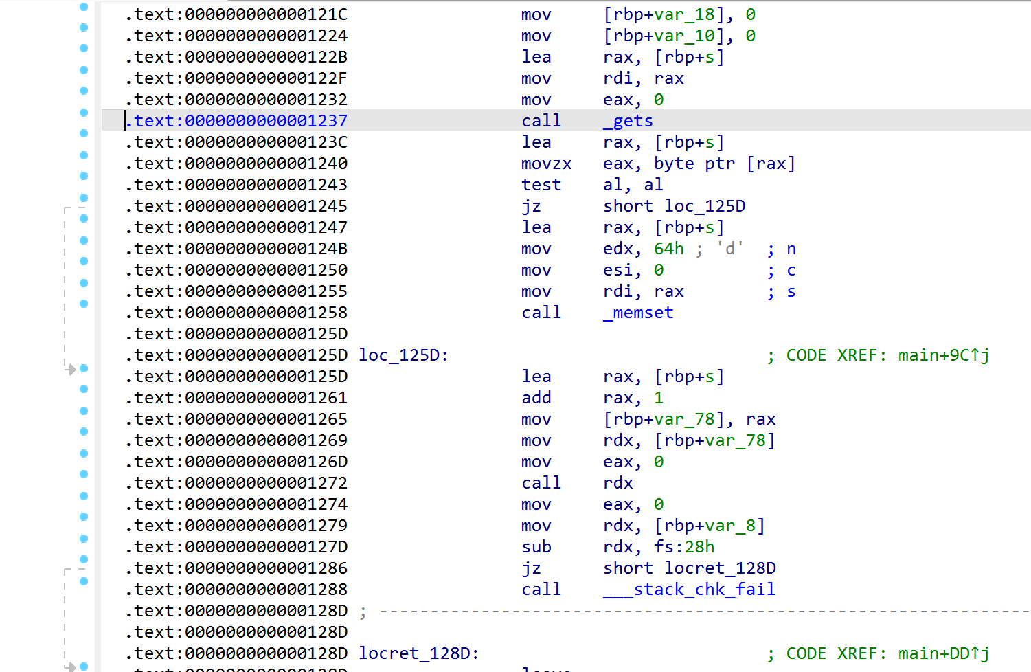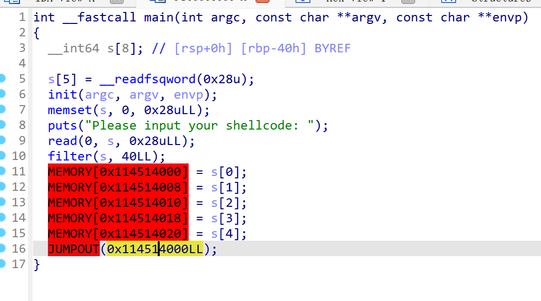 memset 会清空输入,jz short loc_1250 可以直接跳到执行 shellcode 的命令。而该指令在 ZF=0 时生效。test al, al 为对两数进行位与,结果为 0 时ZF 为 0,否则为 1。需要\x00开头进行绕过,因为byte转换所以\x00转化回去就是0,al 来源于 rax 低 8 位,rax 来源于 s 字符串首位,所以要在payload开头加’\x00’