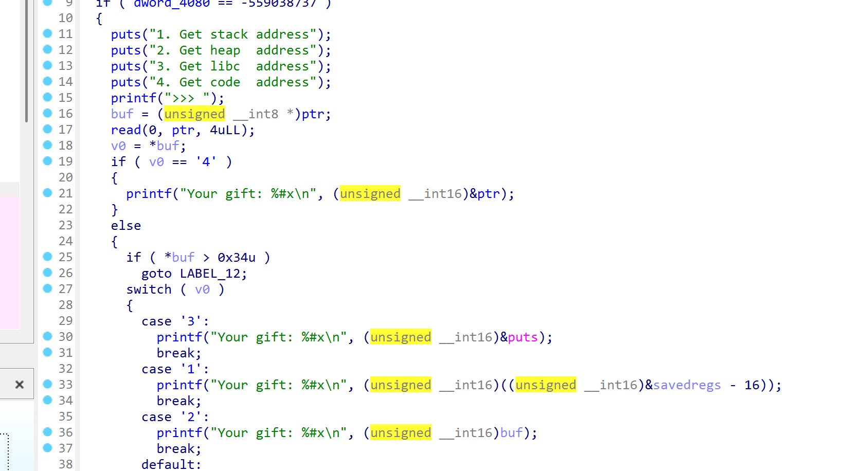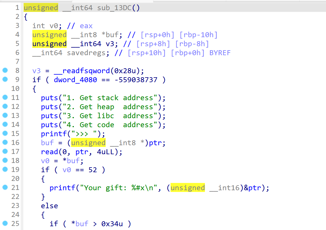 另外,前面函数可以控制read长度容易存在溢出,输入大量字符也能发现漏洞