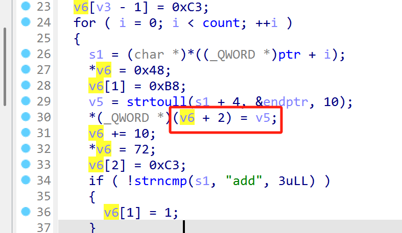v10 = __readfsqword(0x28u); puts("offset?"); fgets(s, 8, stdin); v2 = (int)(atof(s) * 12.0); v3 = 12 * dword_402C + 4; v6 = (char *)mmap((void *)0x100000, 12 * dword_402C + 20, 7, 34, -1, 0LL); v6[v3 - 4] = 72; v6[v3 - 3] = -119; v6[v3 - 2] = -40; v6[v3 - 1] = -61; for ( i = 0; i < dword_402C; ++i ) { s1 = (char *)*((_QWORD *)ptr + i); *v6 = 72; v6[1] = -72; v5 = strtoull(s1 + 4, &endptr, 10); *(_QWORD *)(v6 + 2) = v5; v6 += 10; *v6 = 72; v6[2] = -61; if ( !strncmp(s1, "add", 3uLL) ) { v6[1] = 1; } else if ( !strncmp(s1, "sub", 3uLL) ) { v6[1] = 41; } else if ( !strncmp(s1, "xor", 3uLL) ) { v6[1] = 49; } else if ( !strncmp(s1, "and", 3uLL) ) { v6[1] = 33; } v6 += 3; } v7 = ((__int64 (*)(void))(v2 + 0x100000))(); printf("result = %llu\n", v7); munmap((void *)0x100000, v3); return __readfsqword(0x28u) ^ v10; }