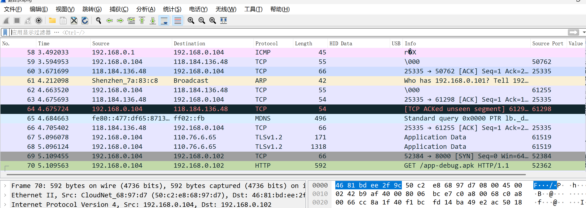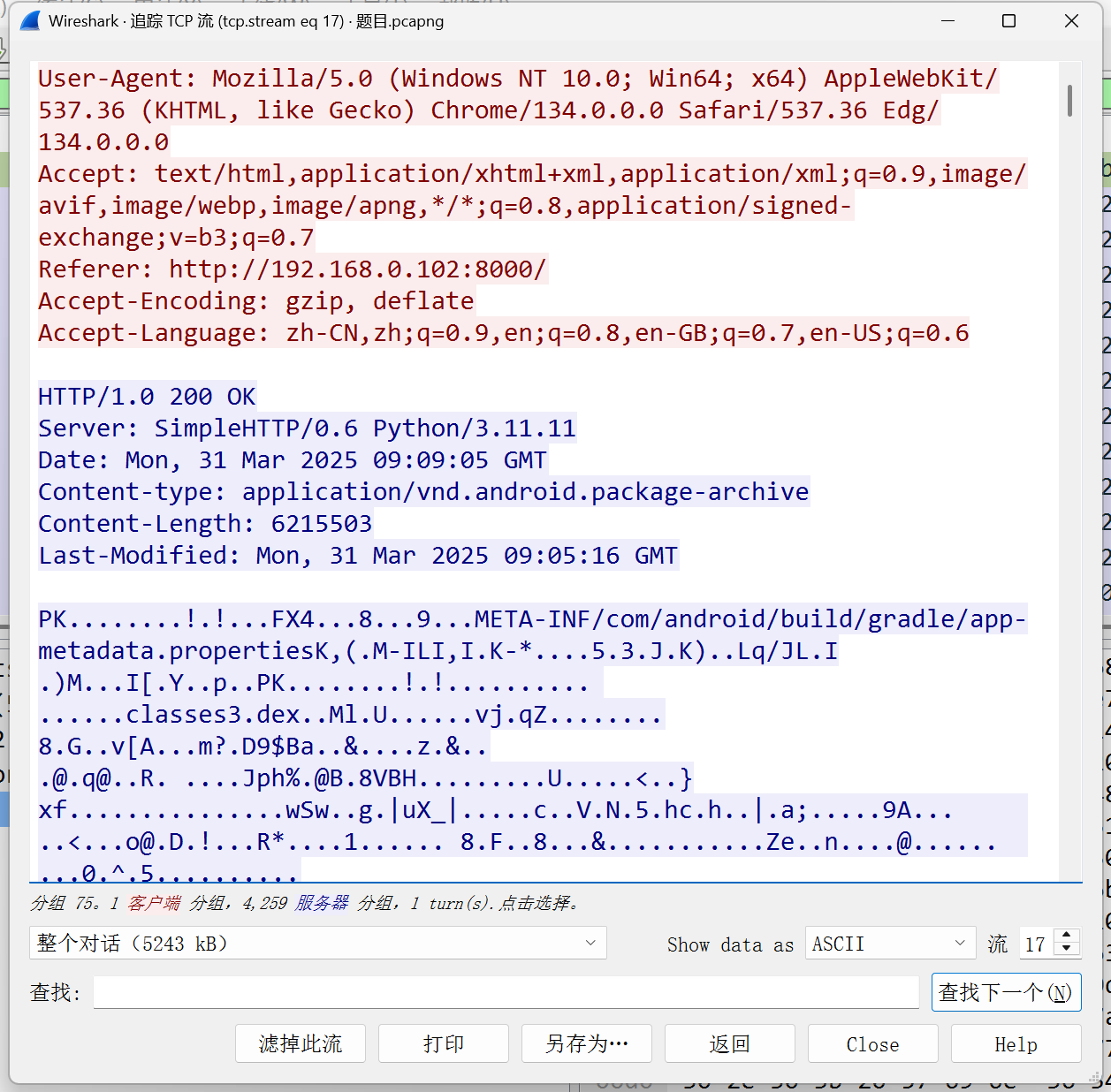 追踪tcp发现有apk,这里提取原始数据有个方便的点是直接全选然后把上面一部分删掉,手动复制比较费时间