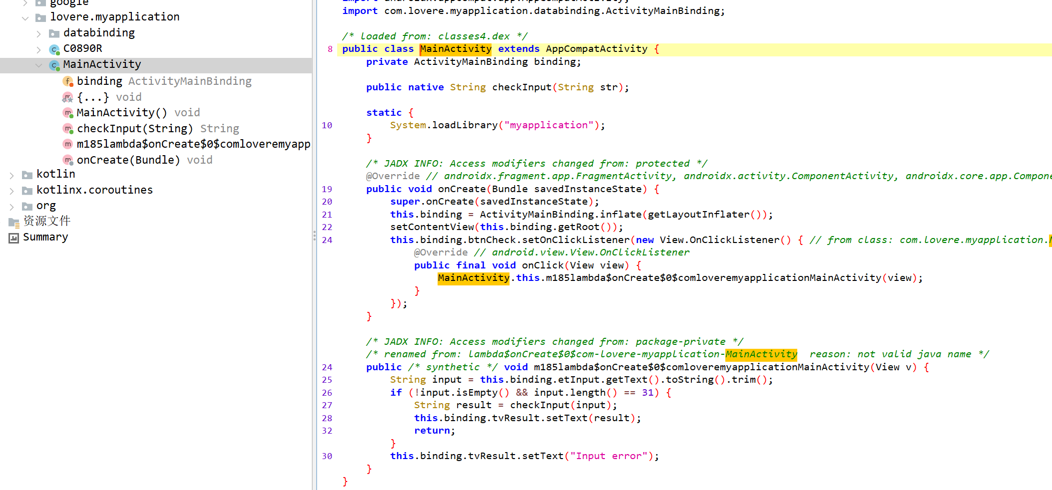 最后因为长度是31,而flag求出来26,一眼顶针把a2变成aa,这道题难绷的点在于队友通过动调so和patch内存得到了上面的flag,但是两个人一直没想通为啥是31,另外在调试的过程中确实出现了aaaa变成a4的情况