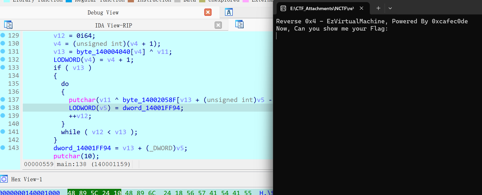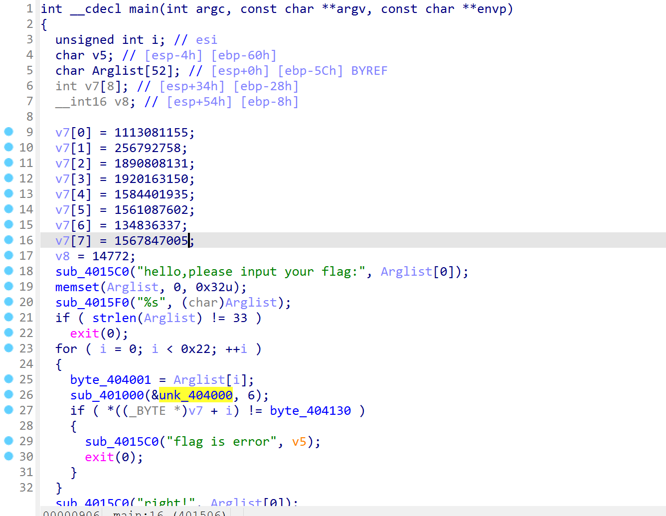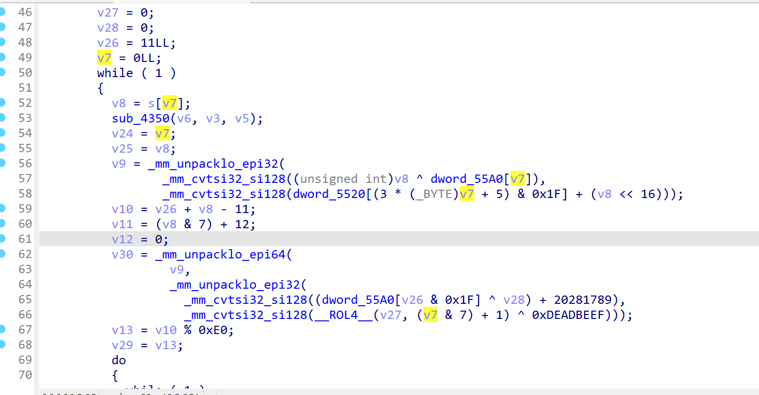 for i in opcode: match i: case 0xA1: print("enc[i - 1] = v25 & v22") case 0xC3: print("v22 = v17 | v18") case 0xB2: print("v23 = ~v17") case 0xE5: print("v24 = ~v18") case 0xF1: print("v17 = input[i]") print("v18 = input[++i]") case 0xD4: print("v25 = v24 | v23") case 0xBF: print("v6 = i++") print("v21[0] = enc[v6]") case 0x99: print("i = 0") case 0xBB: print("enc[i - 1] = i + v21[0] - 1")
