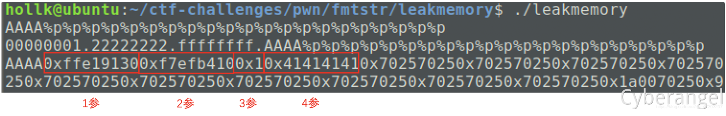 输入的AAAA对应后面到0x41414141,也就是格式化字符串的第四个参数,如果将AAAA替换成某个函数的got地址,那么程序就会打印出这个函数的真实地址