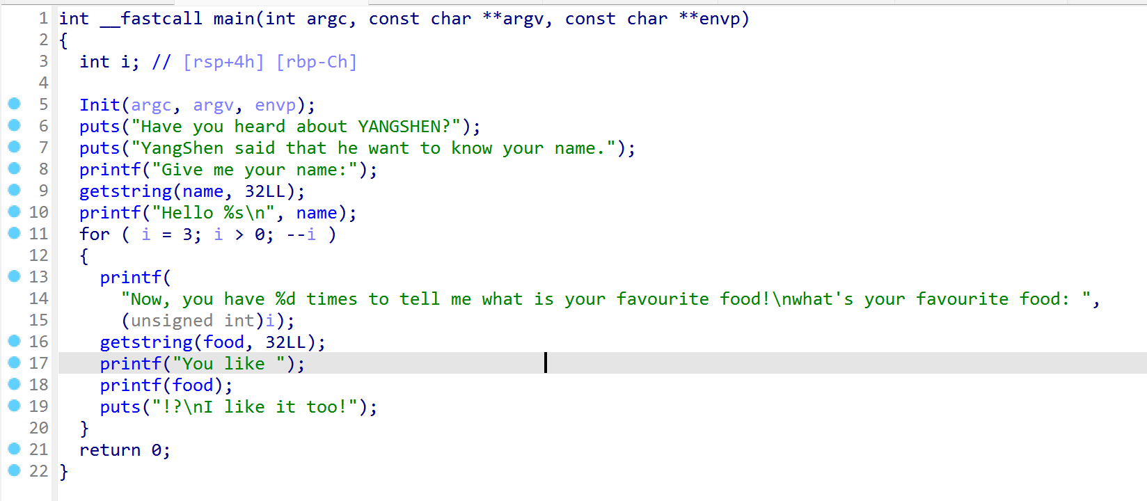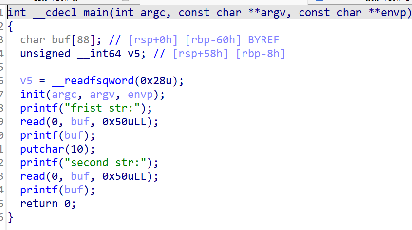 覆盖栈内存 1 2 3 4 5 6 7 8 9 10 11 12 13 14 15 16 17 #include <stdio.h> int a = 123 , b = 456 ;int main () { int c = 789 ; char s[100 ]; printf ("%p\n" , &c); scanf ("%s" , s); printf (s); if (c == 16 ) { puts ("modified c." ); } else if (a == 2 ) { puts ("modified a for a small number." ); } else if (b == 0x12345678 ) { puts ("modified b for a big number!" ); } return 0 ; }