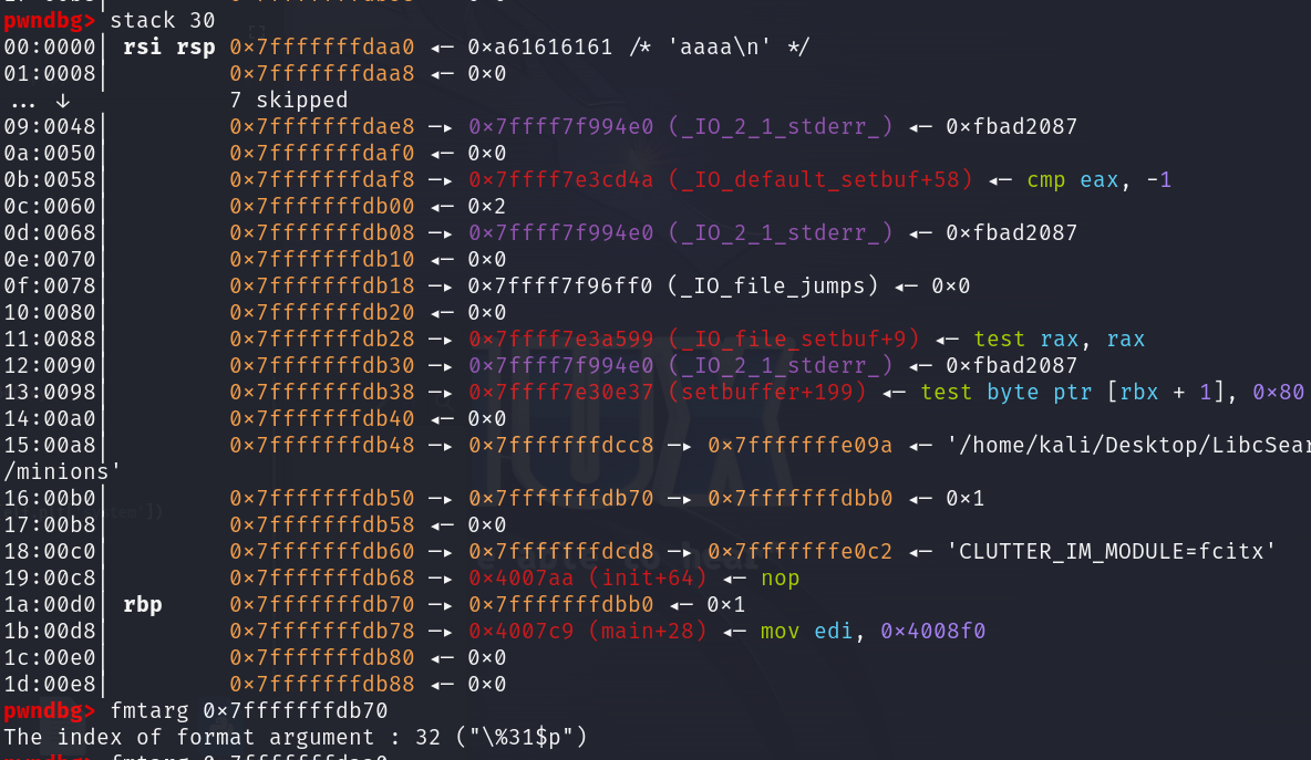 利用 %s 来获取变量所对应地址的内容,有零截断,假设该格式化字符串相对函数调用为第k个参数,那么就可以通过addr%k$s的方式来获取某个指定地址addr的内容