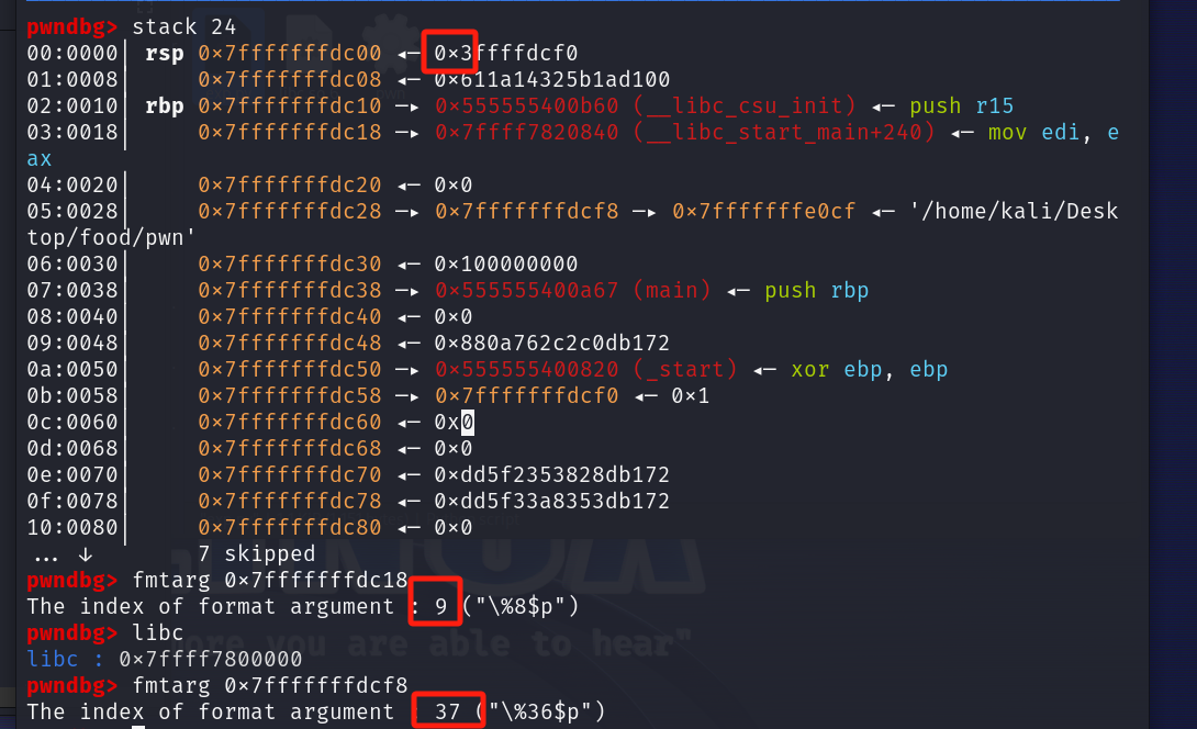 格式化字符串偏移为6,libc,stack,pie偏移分别为19,21,23