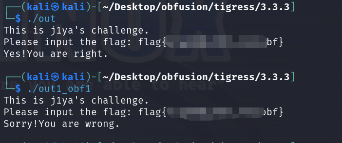 由于算法高度依赖移位,用Tigress混淆会出现问题,于是将算法实现部分放到另一个c文件中分离编译,只用Tigress混淆out.c