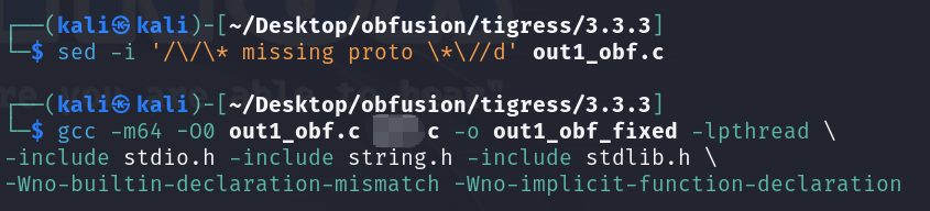移除Tigress自动生成有冲突的extern声明:sed -i ‘//* missing proto *//d’ out1_obf.c